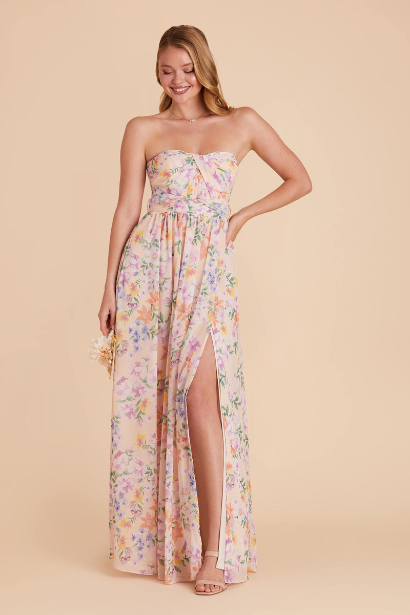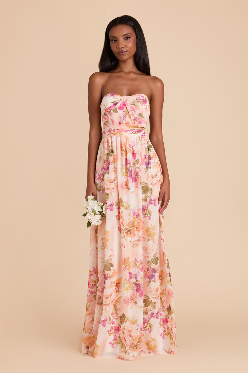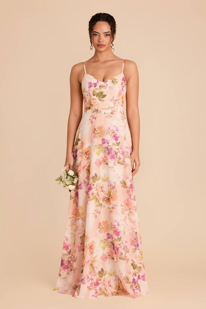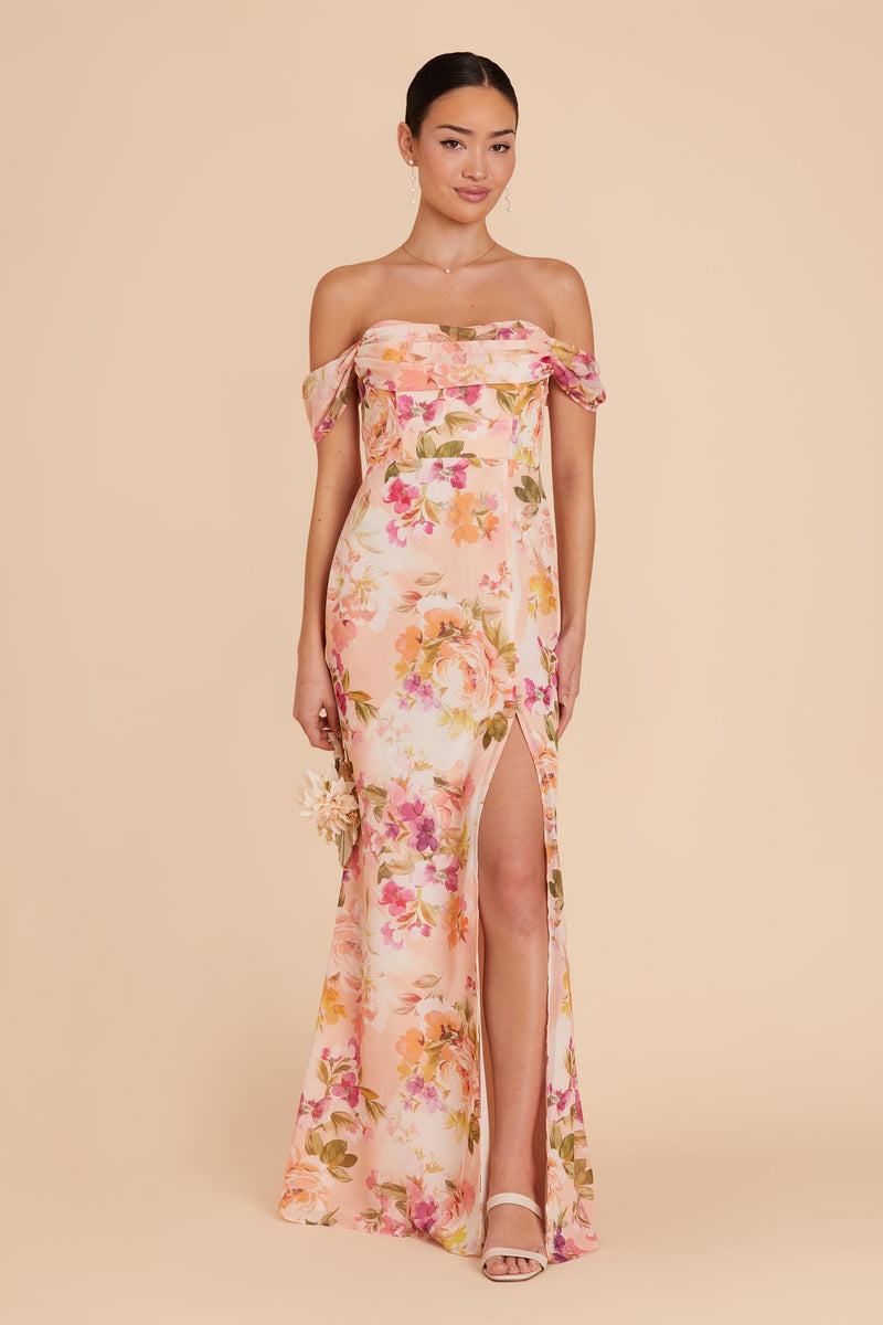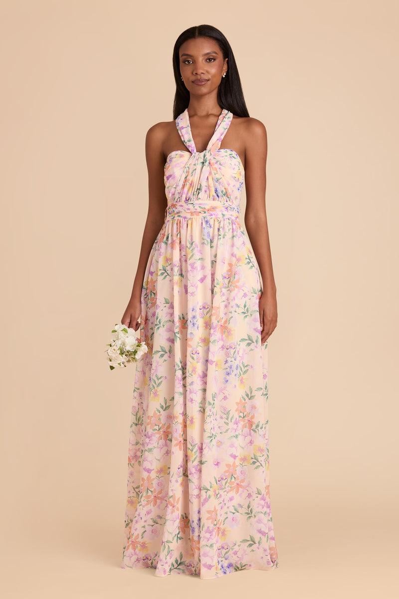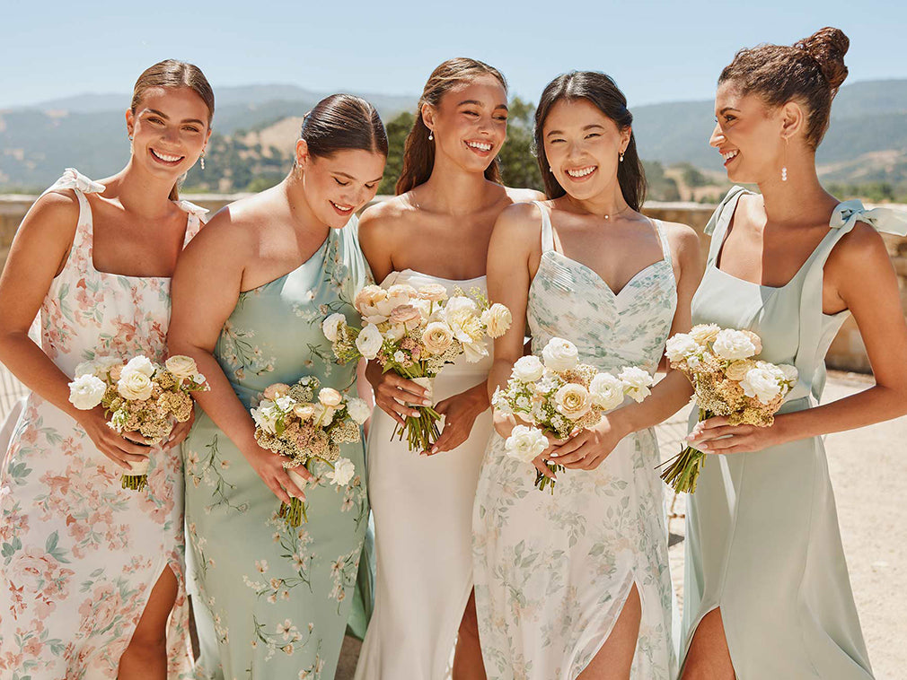Your bridesmaids will be blooming in this soft, floral palette in airy chiffon and supple matte satin.