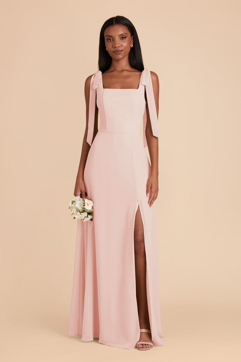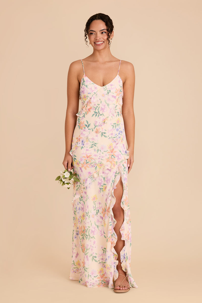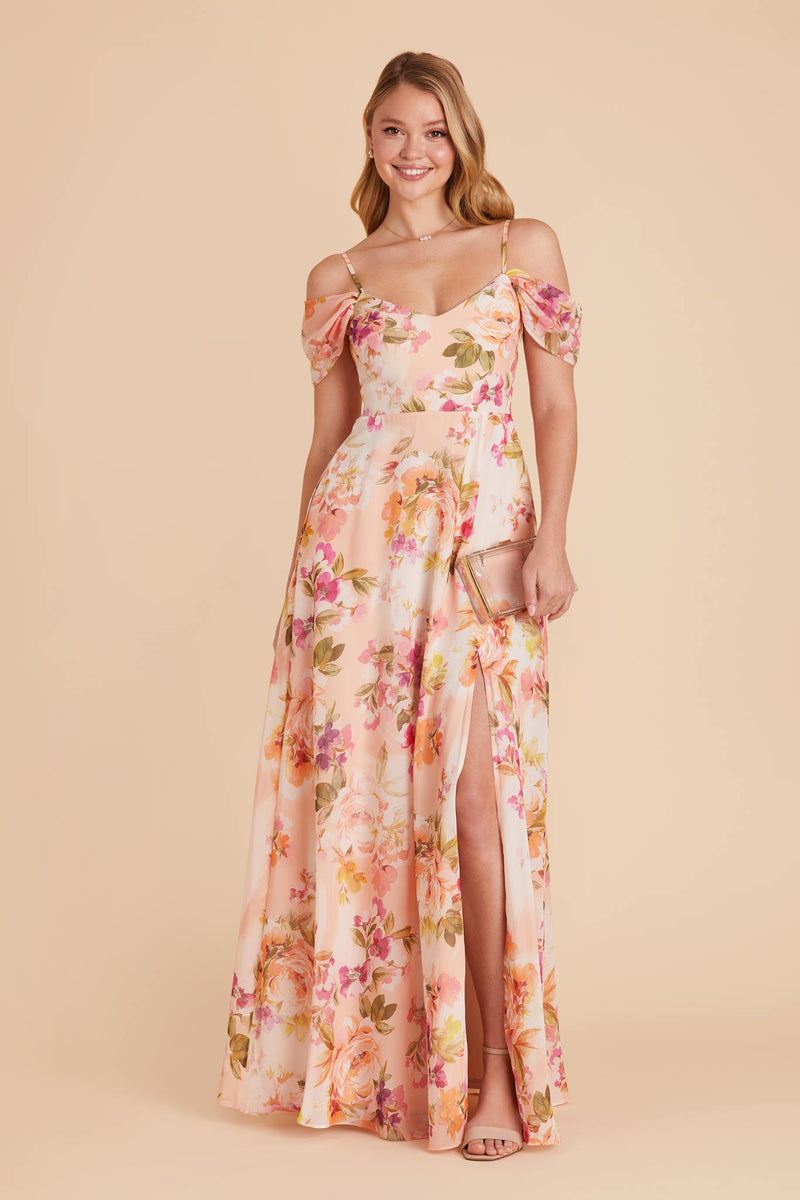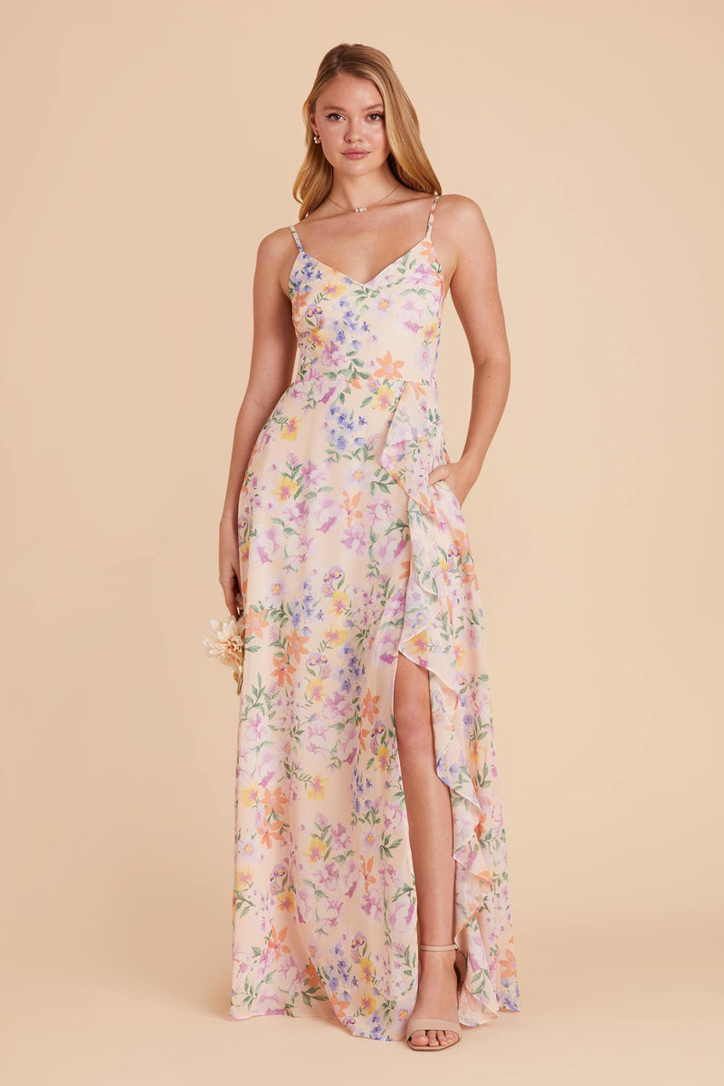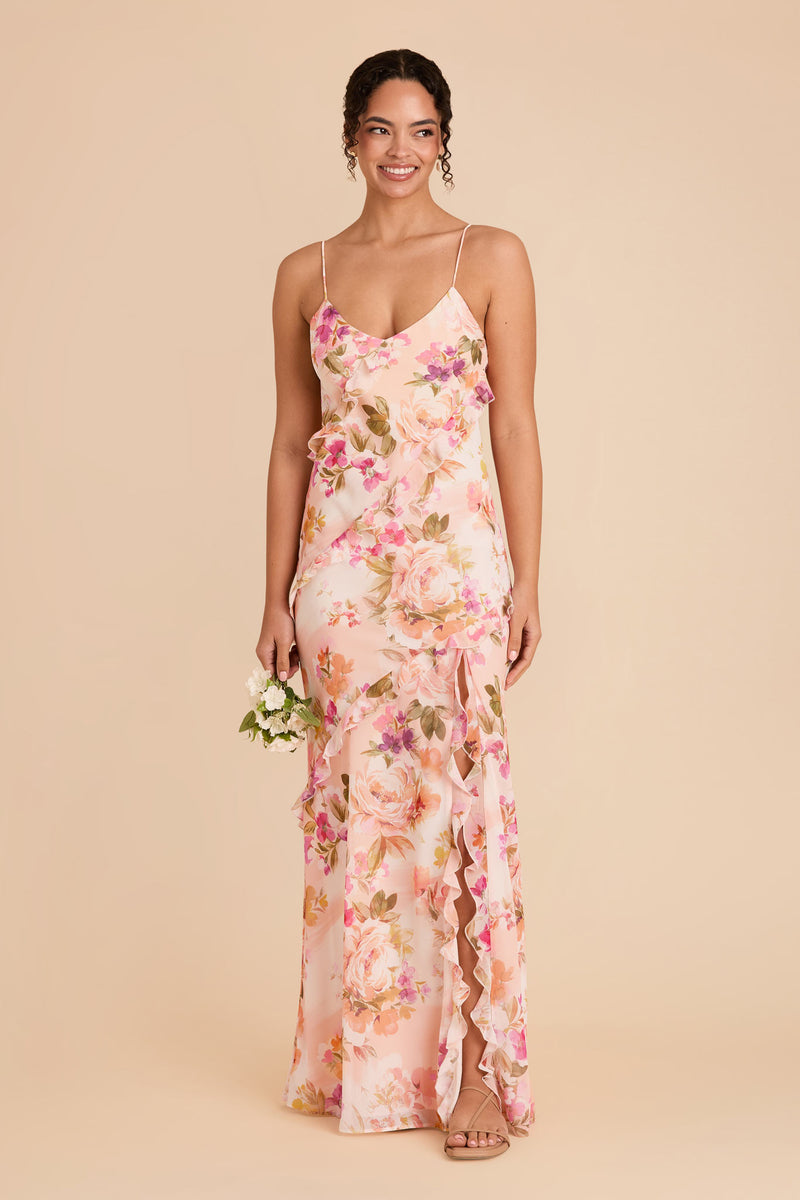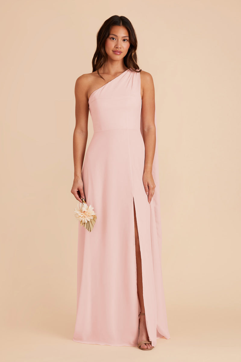 Your bridesmaids will be blooming in this soft, floral palette in airy chiffon and supple matte satin.