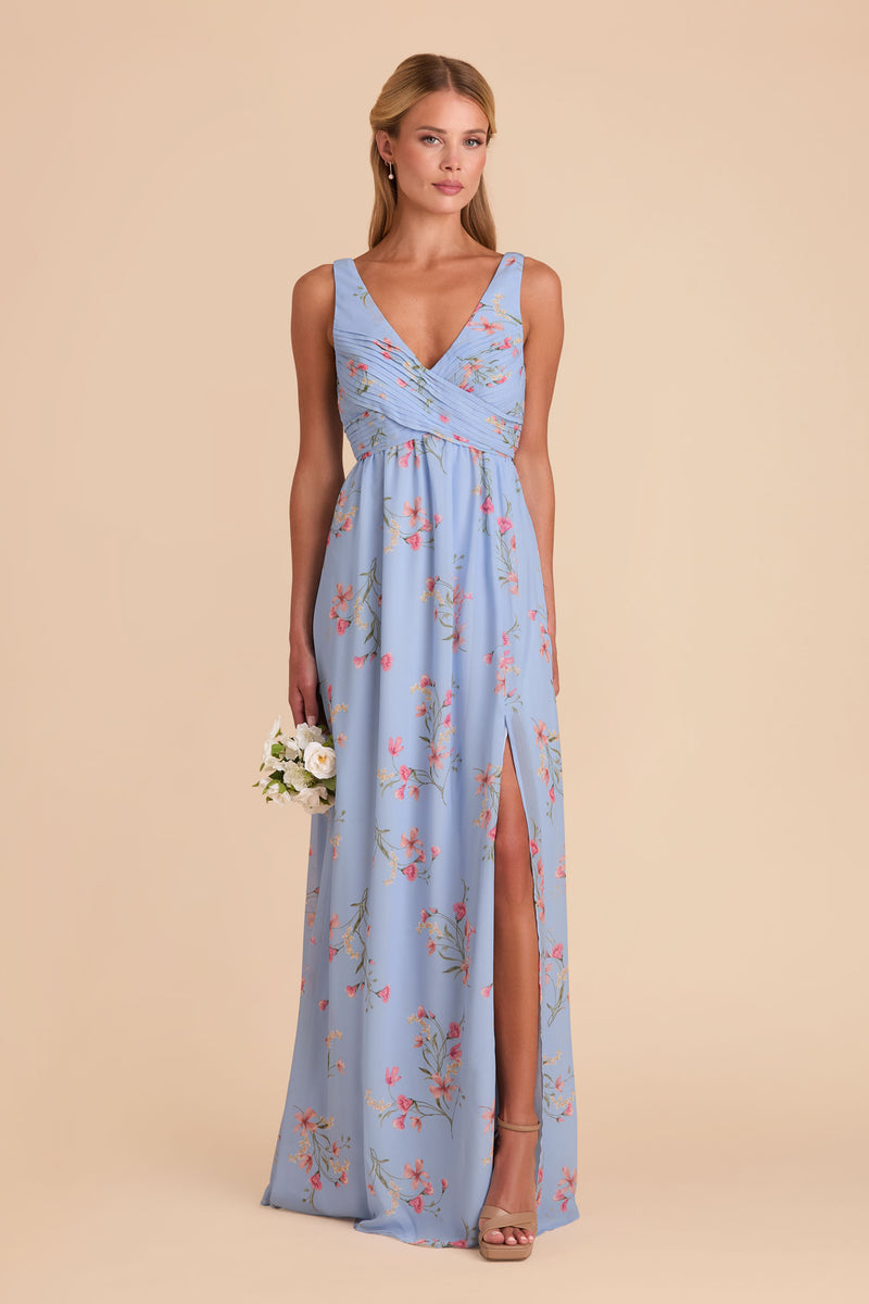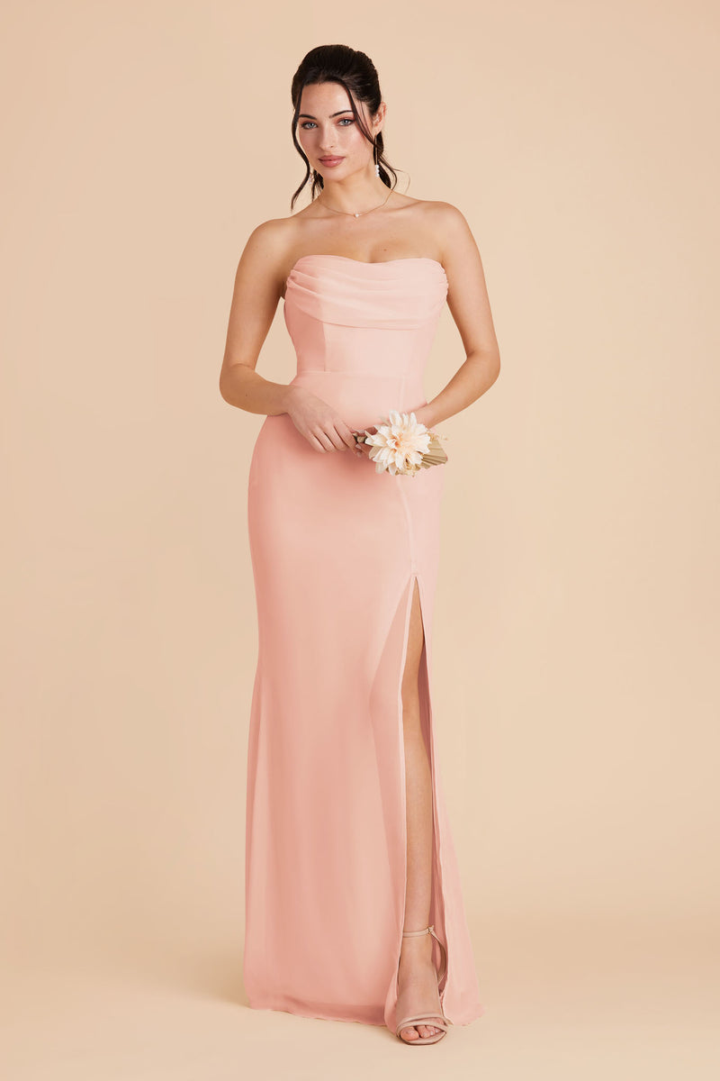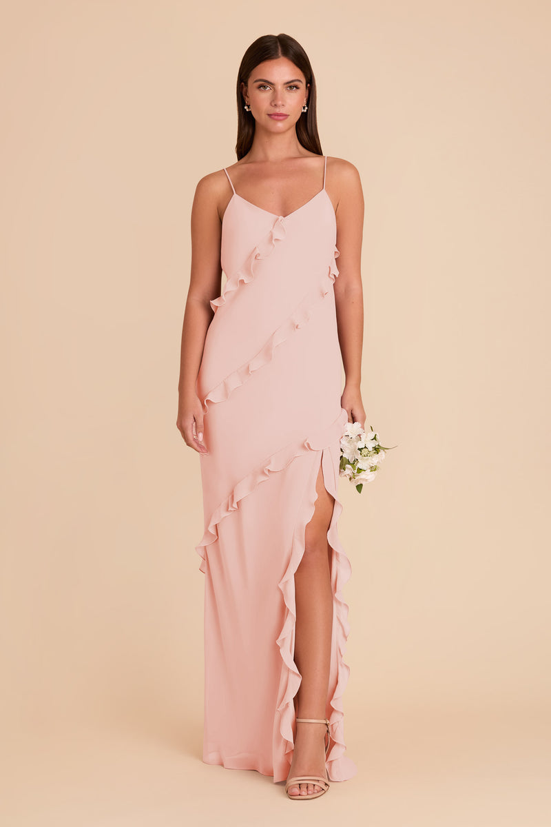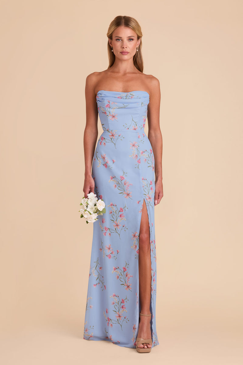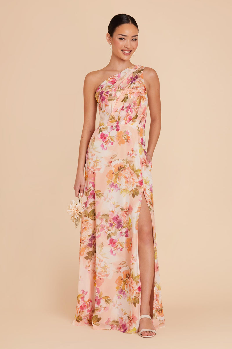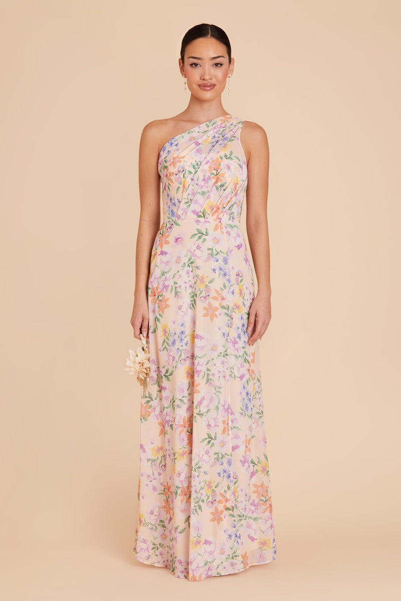 Your bridesmaids will be blooming in this soft, floral palette in airy chiffon and supple matte satin.