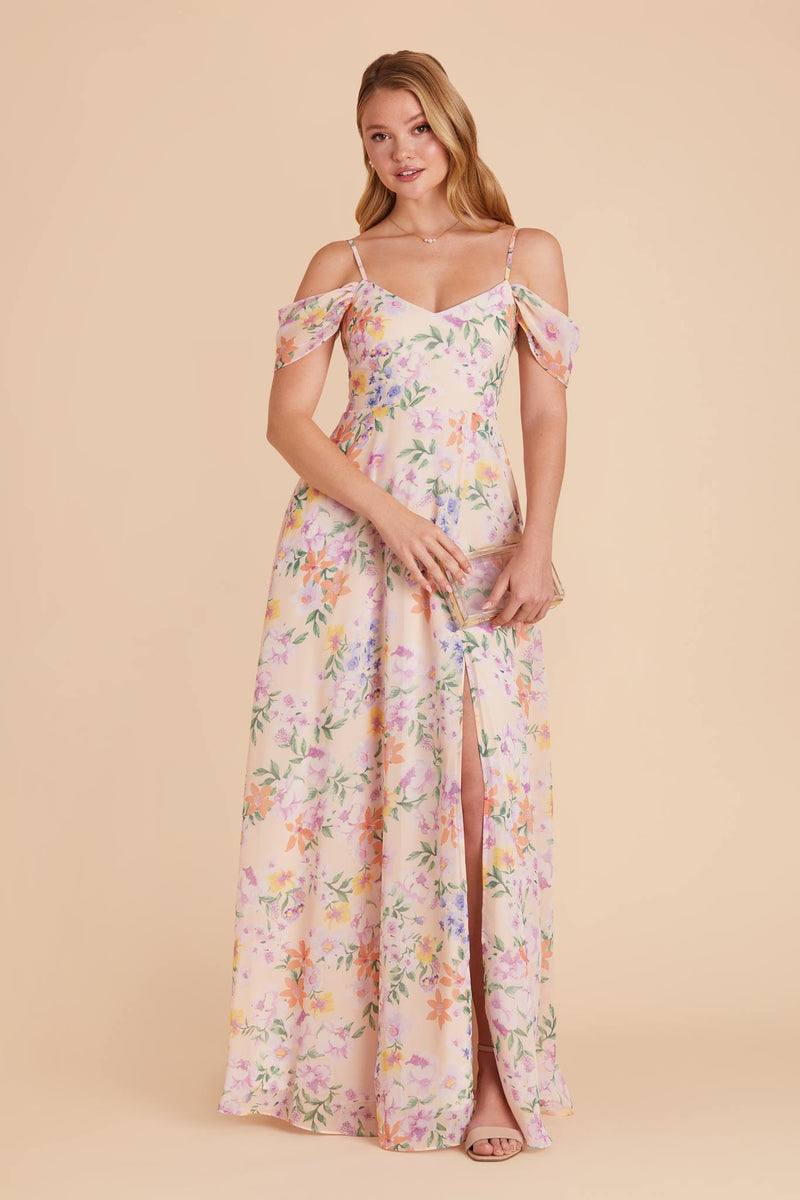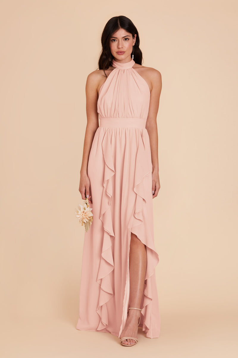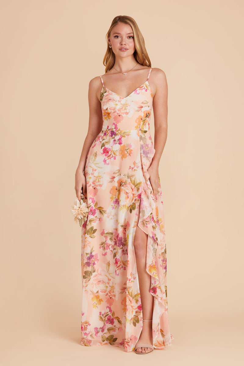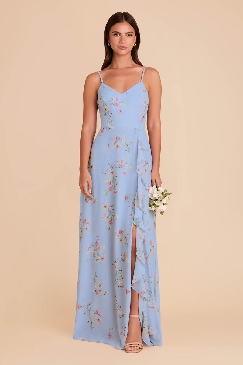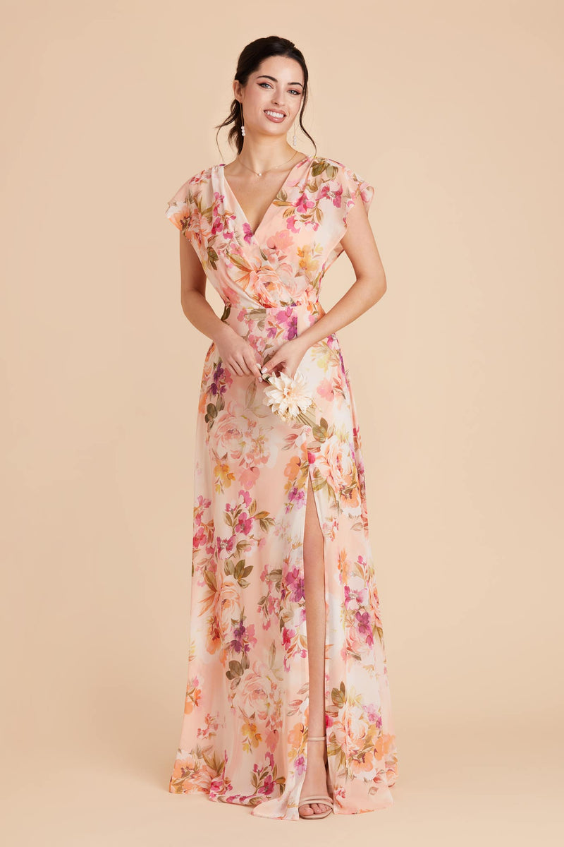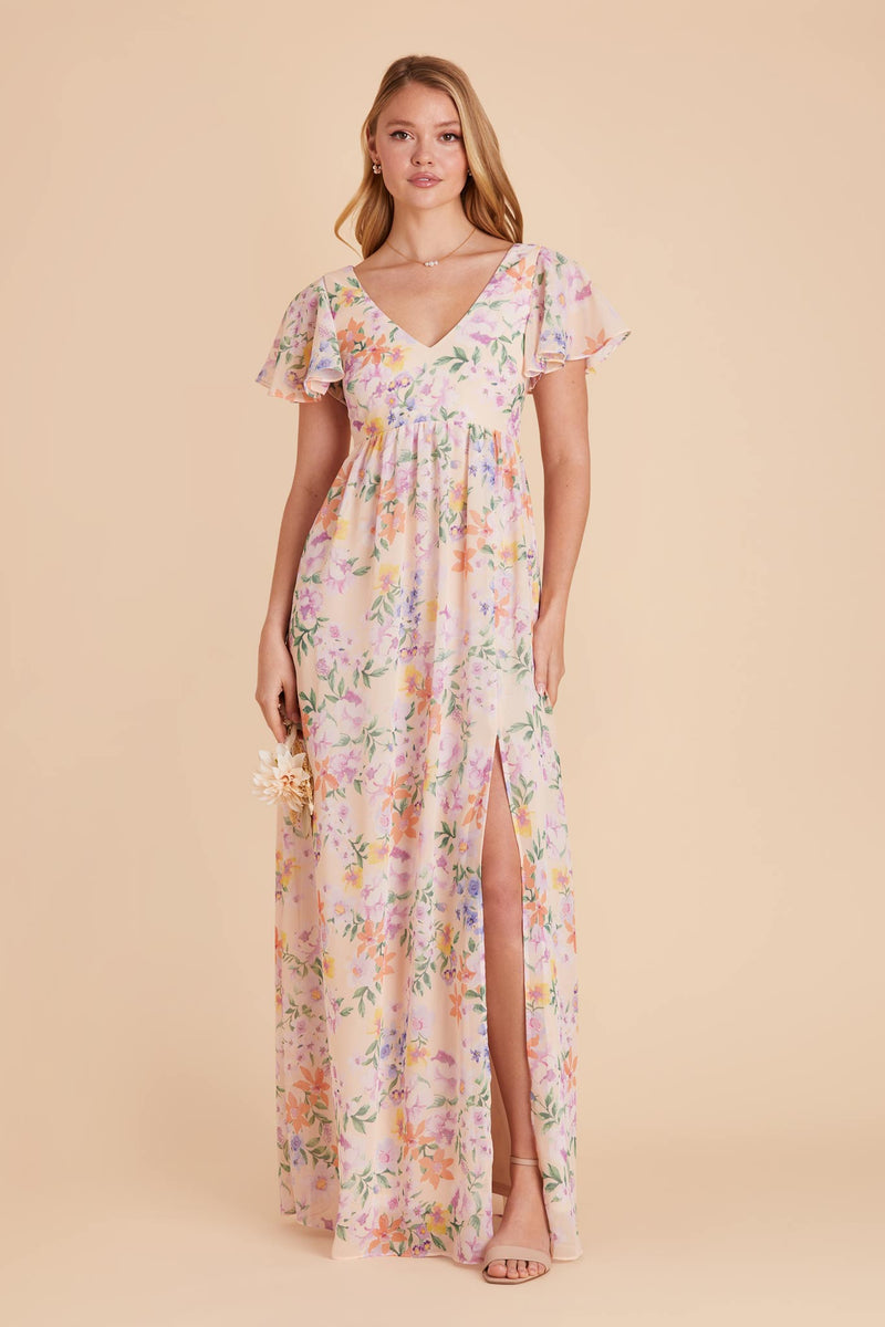 Your bridesmaids will be blooming in this soft, floral palette in airy chiffon and supple matte satin.