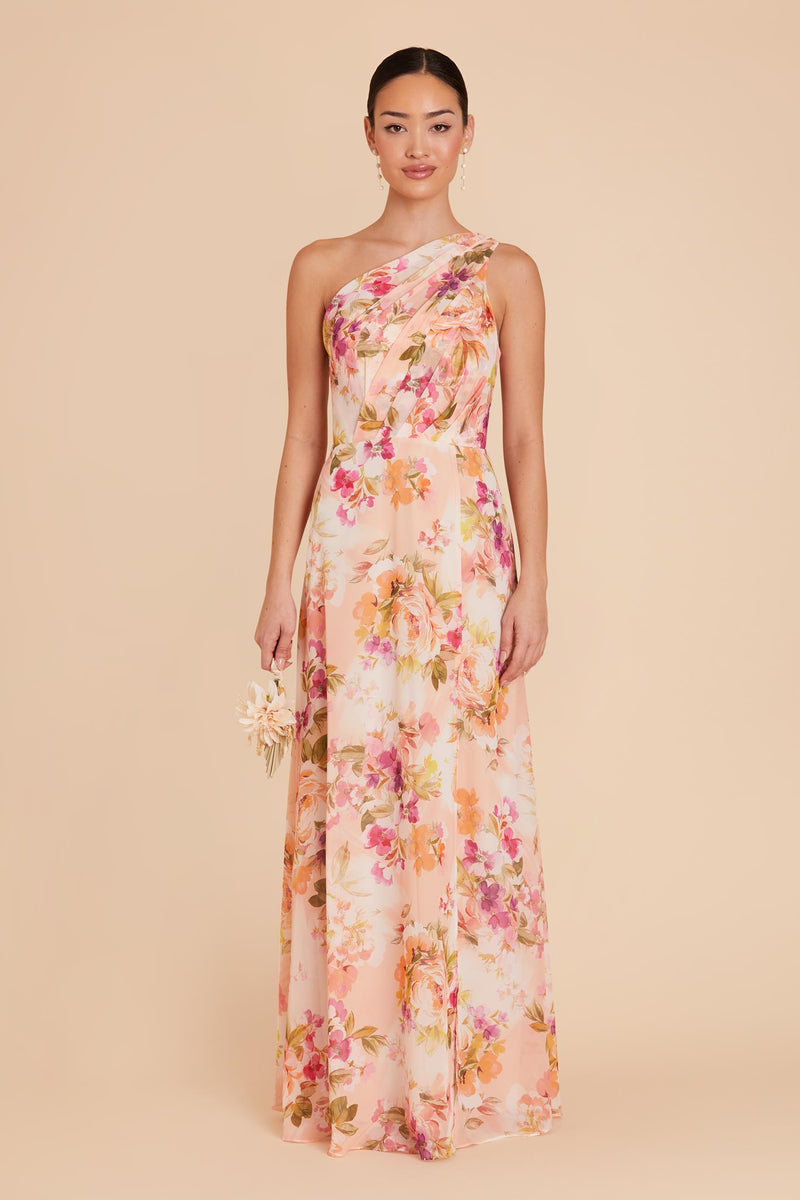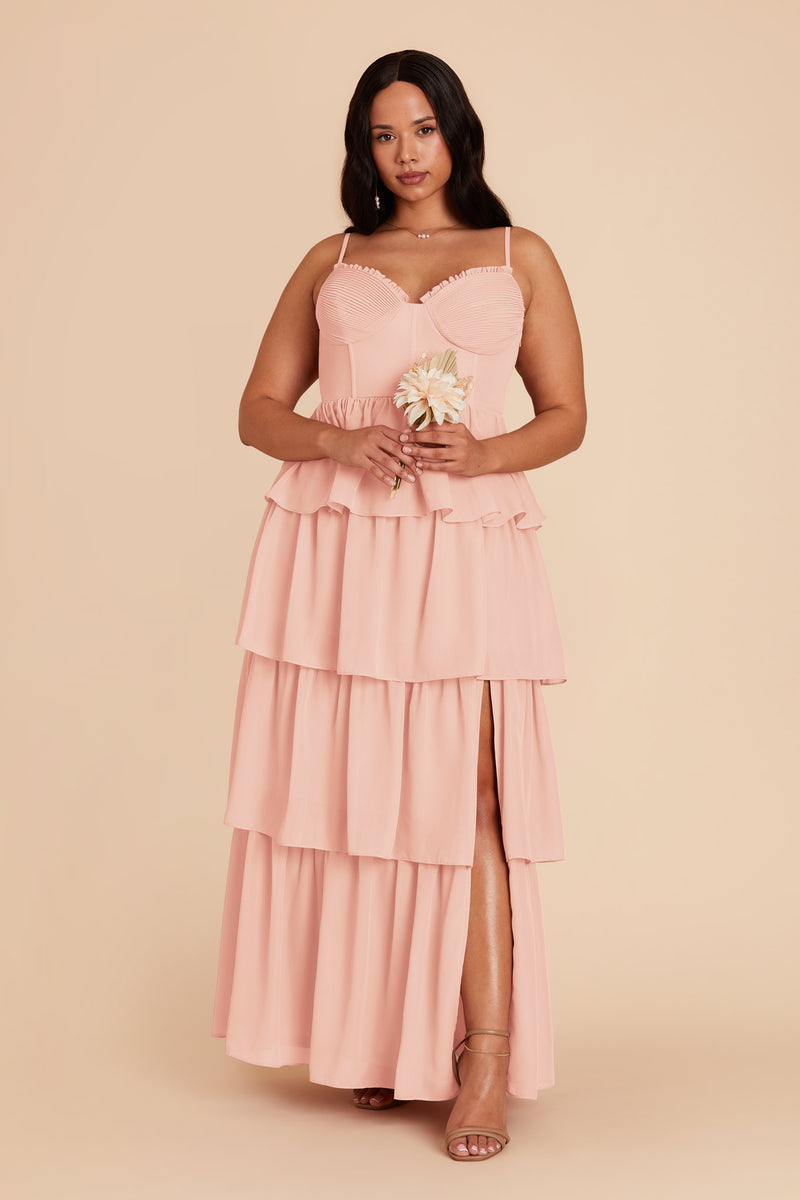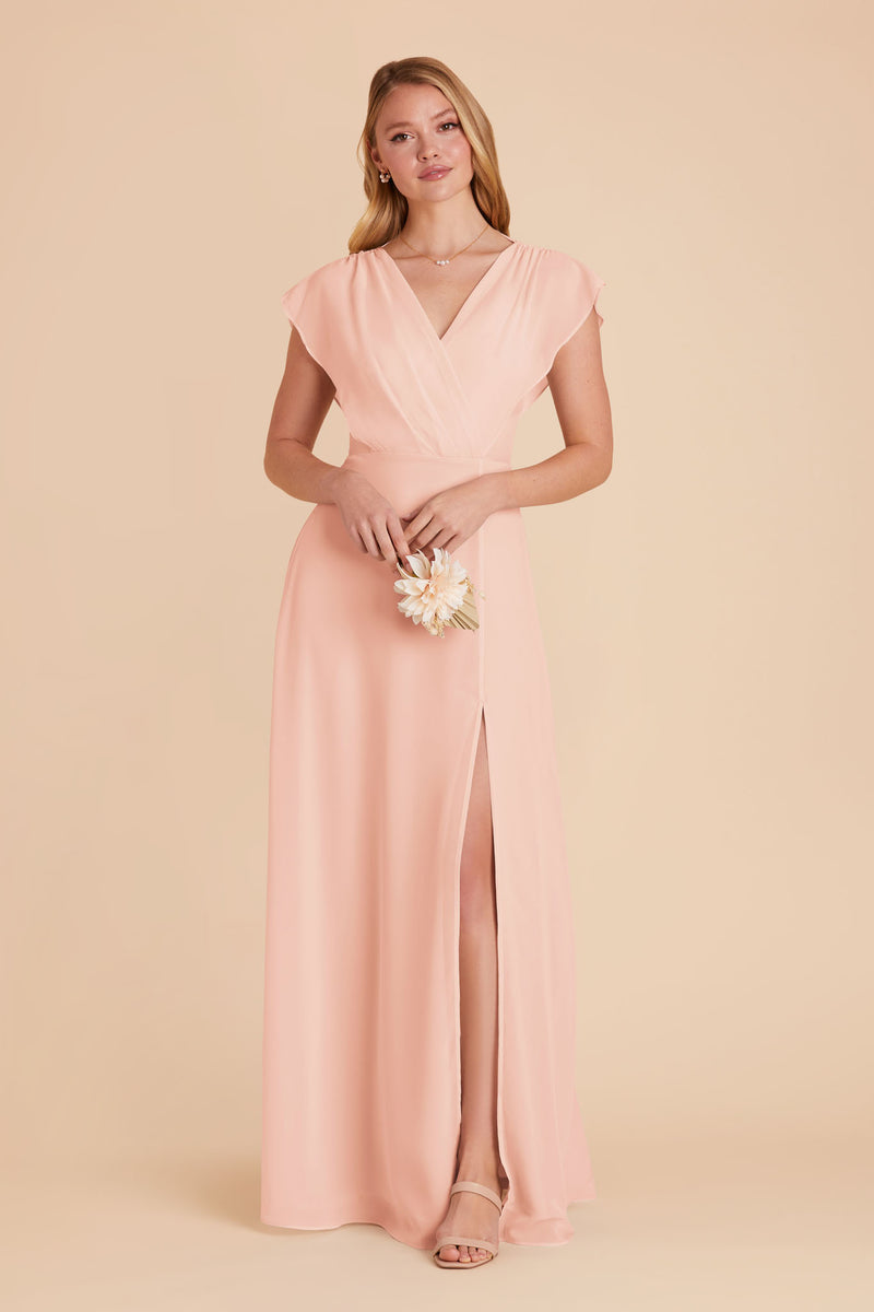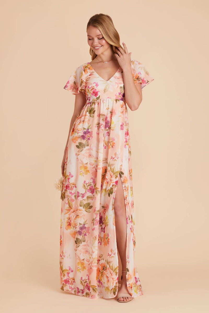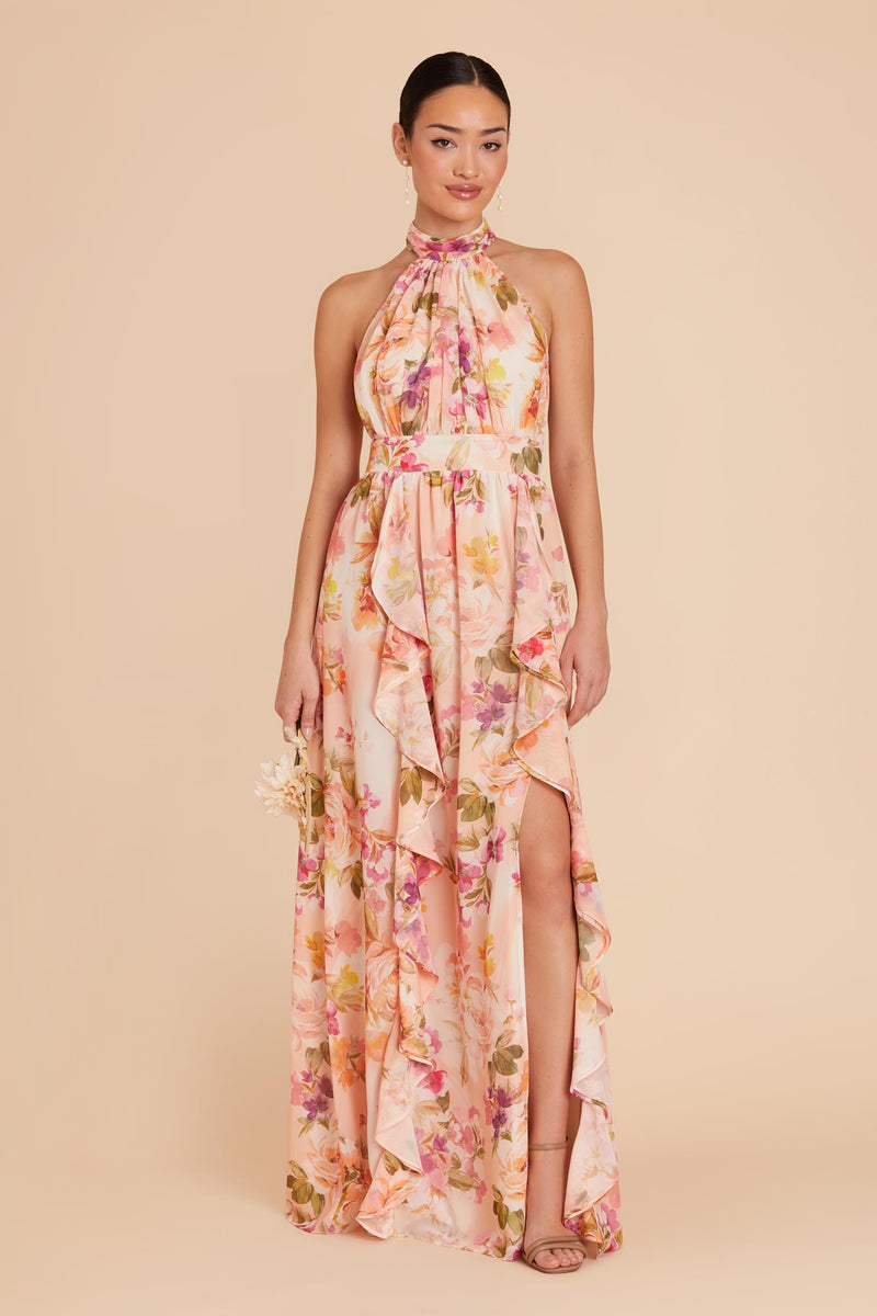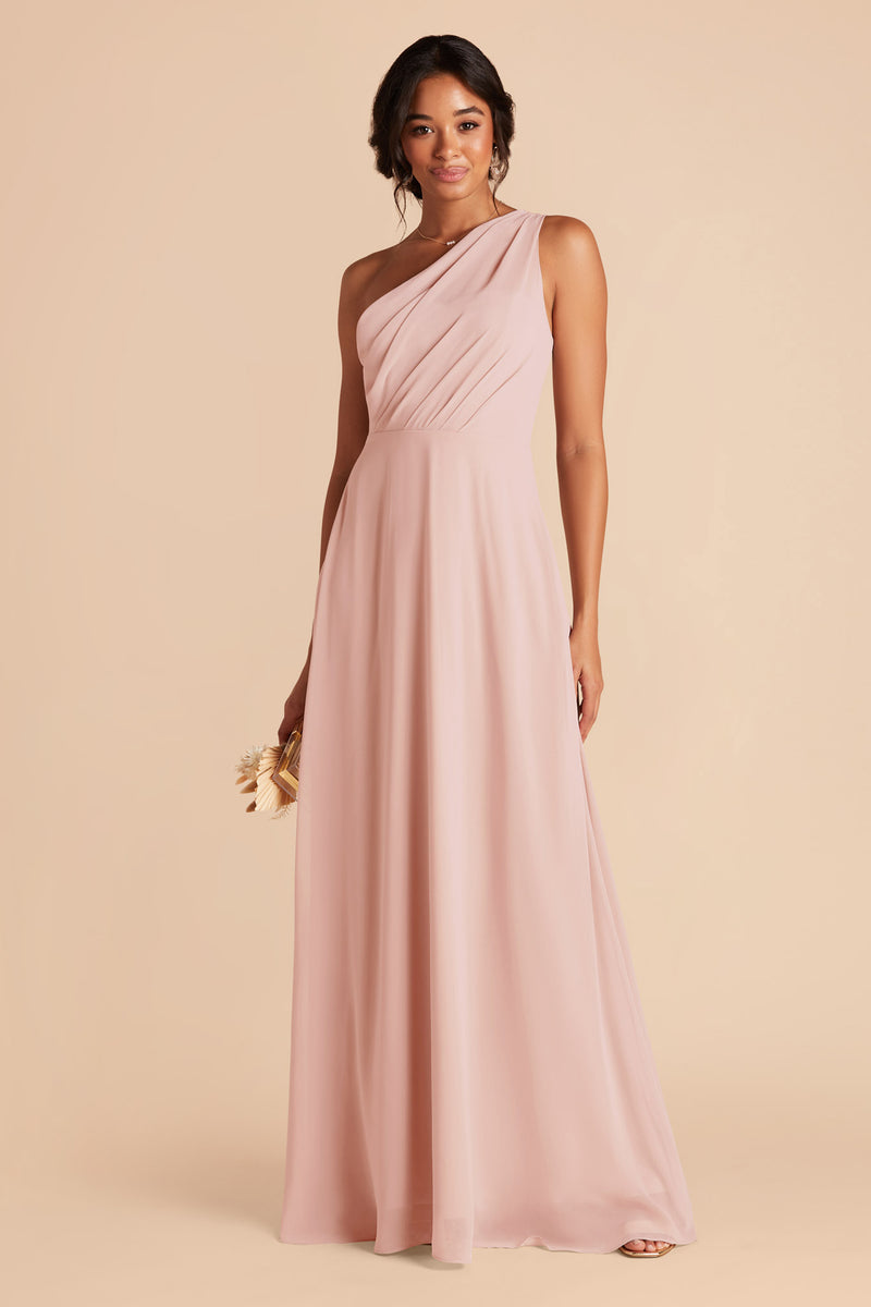 Your bridesmaids will be blooming in this soft, floral palette in airy chiffon and supple matte satin.