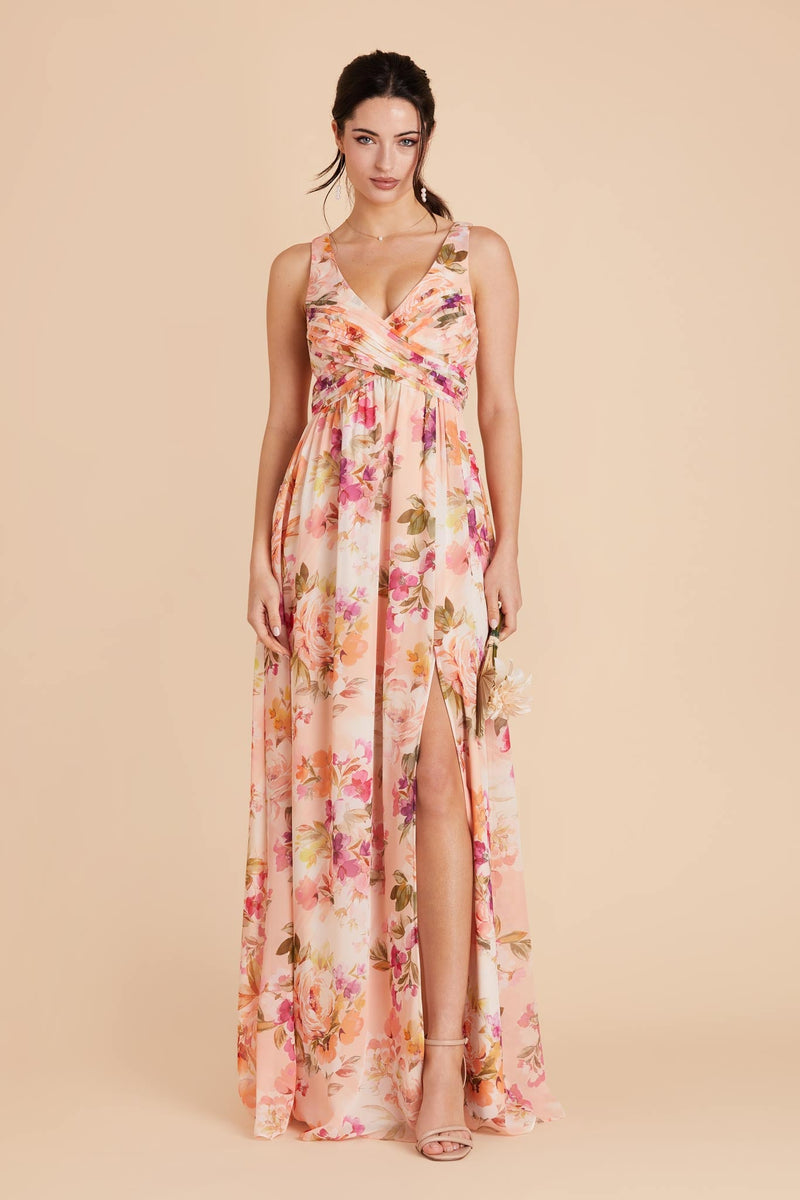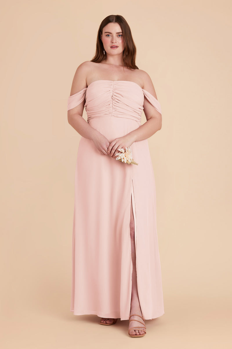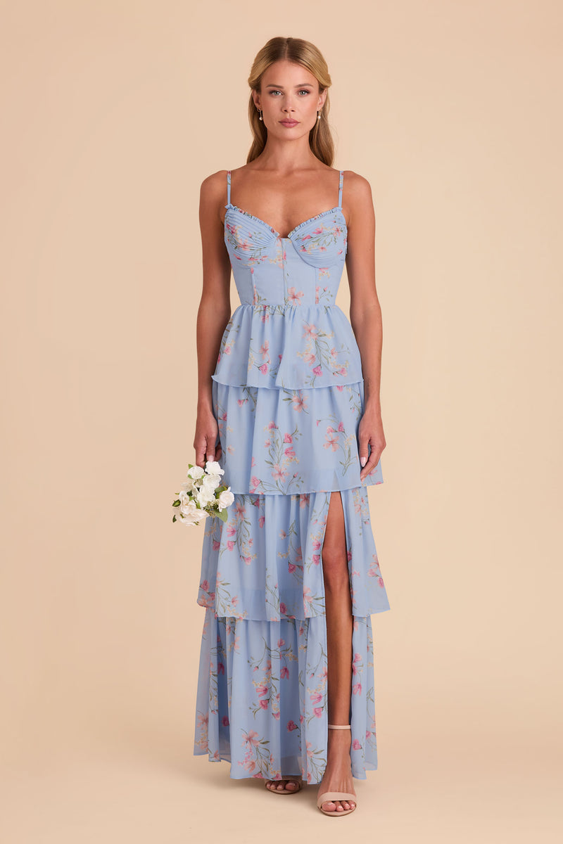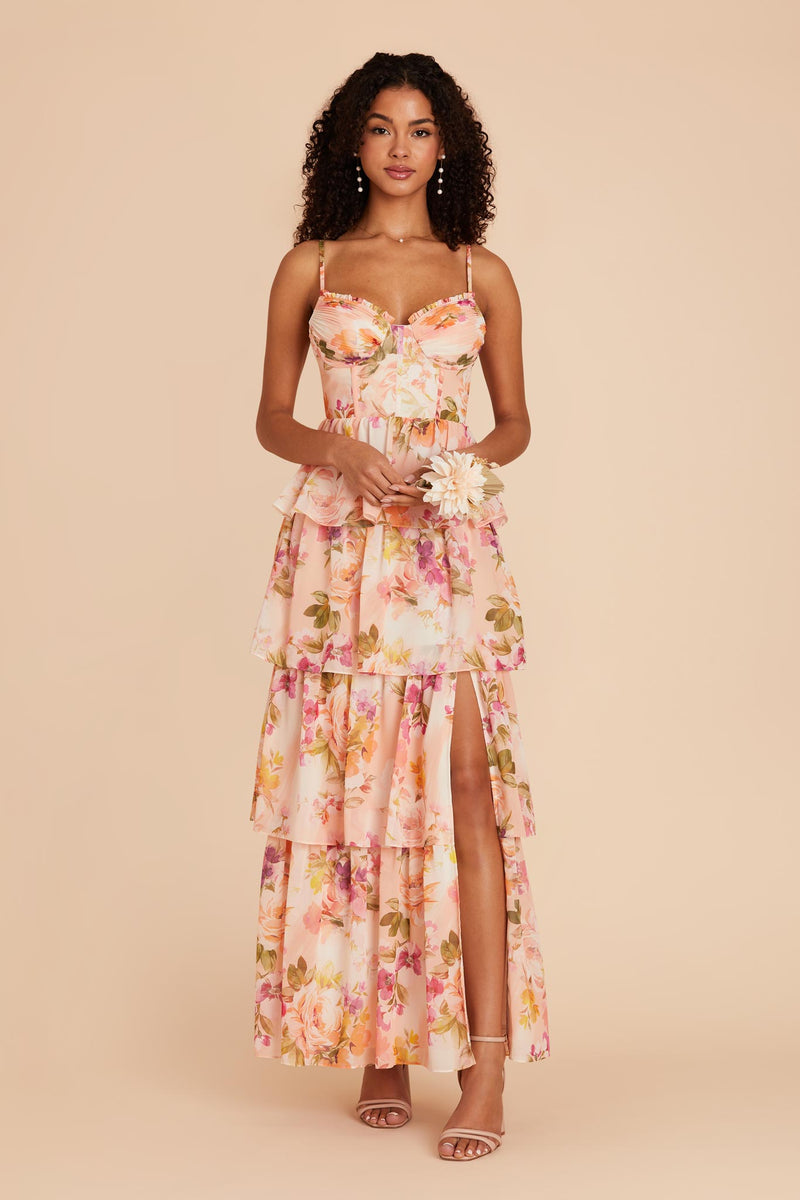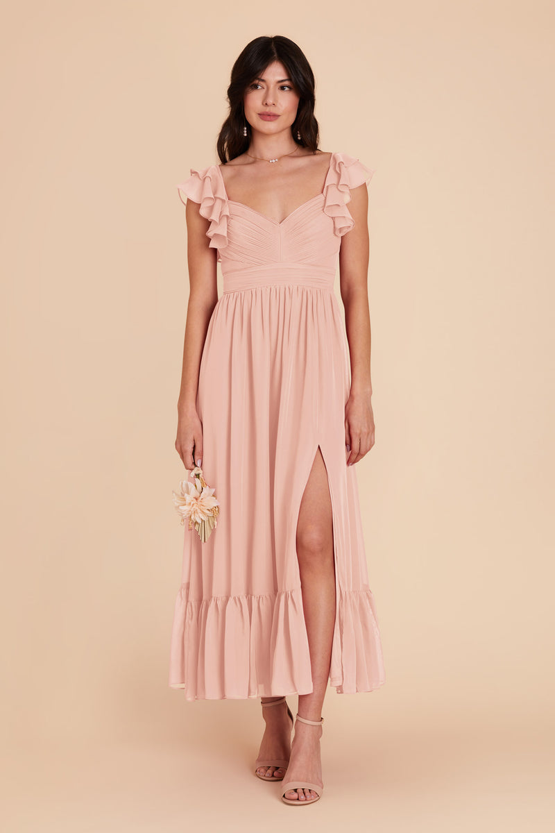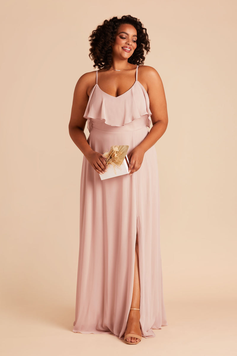 Your bridesmaids will be blooming in this soft, floral palette in airy chiffon and supple matte satin.