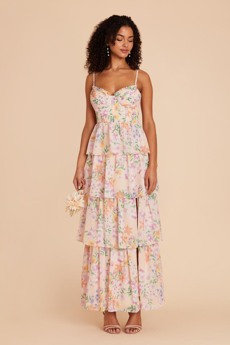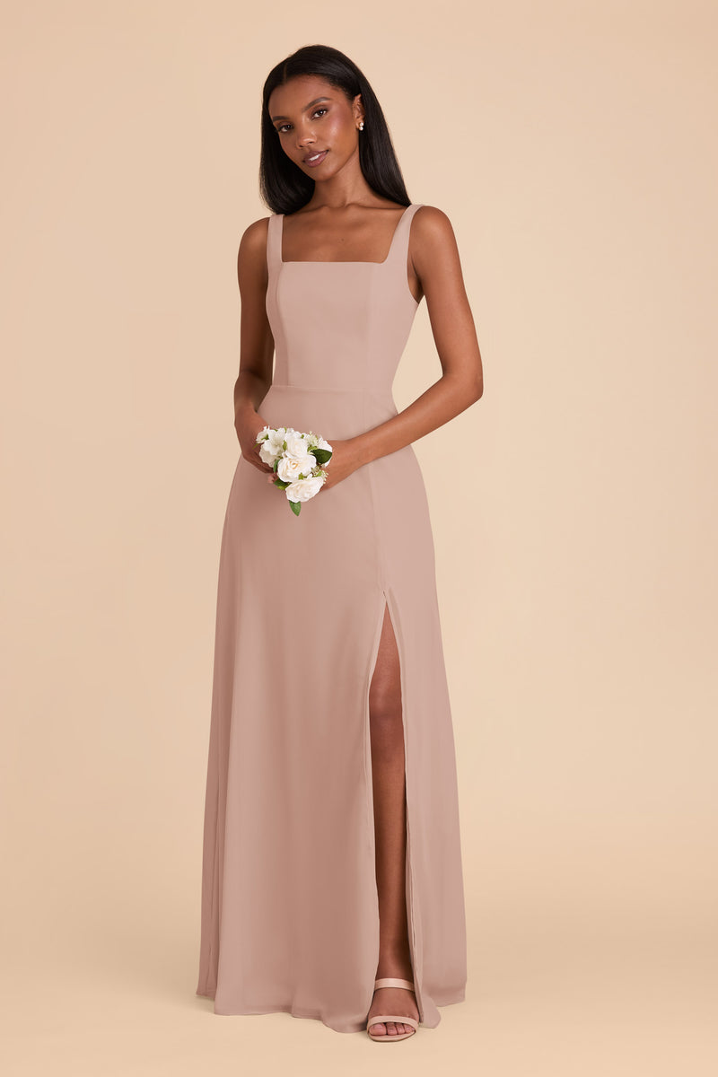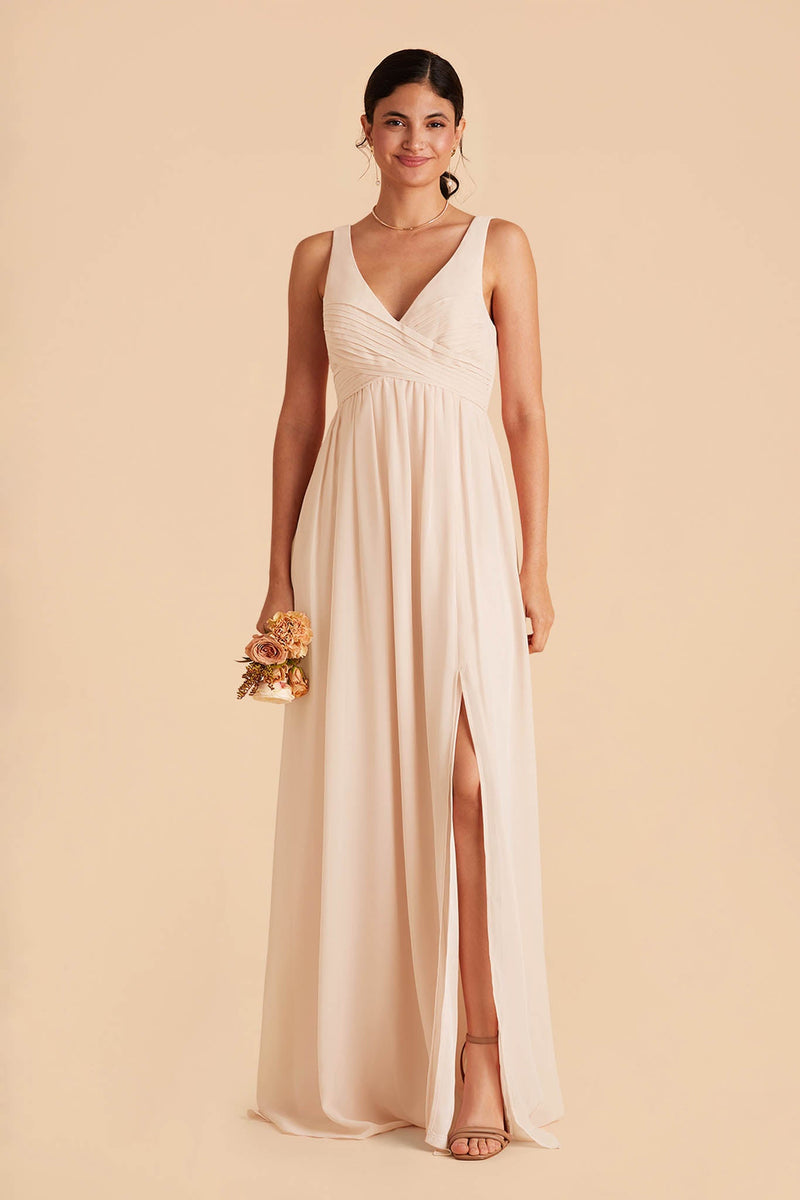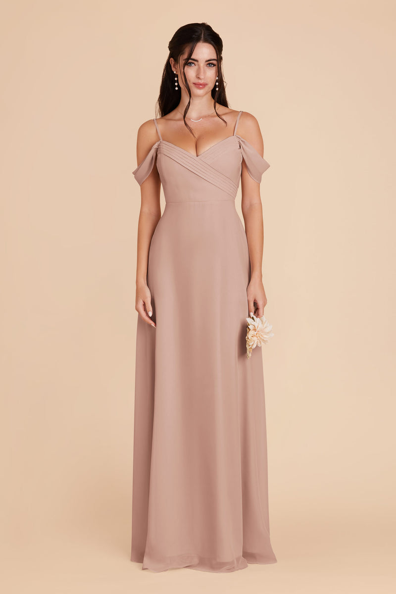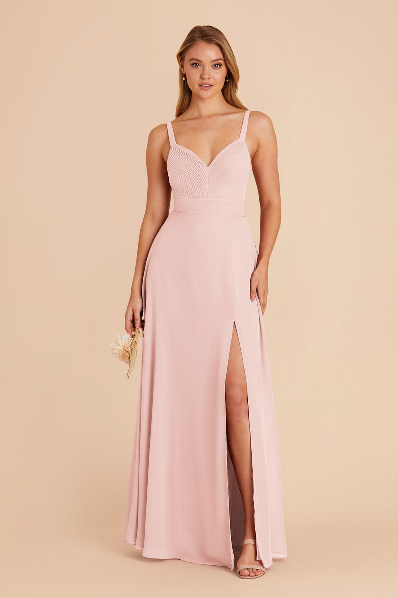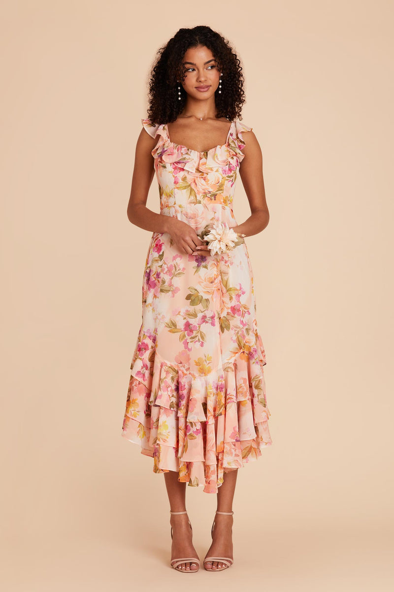 Your bridesmaids will be blooming in this soft, floral palette in airy chiffon and supple matte satin.