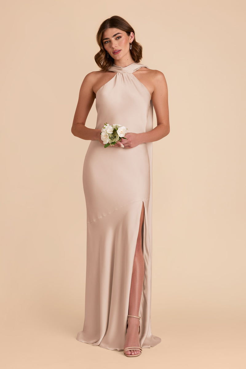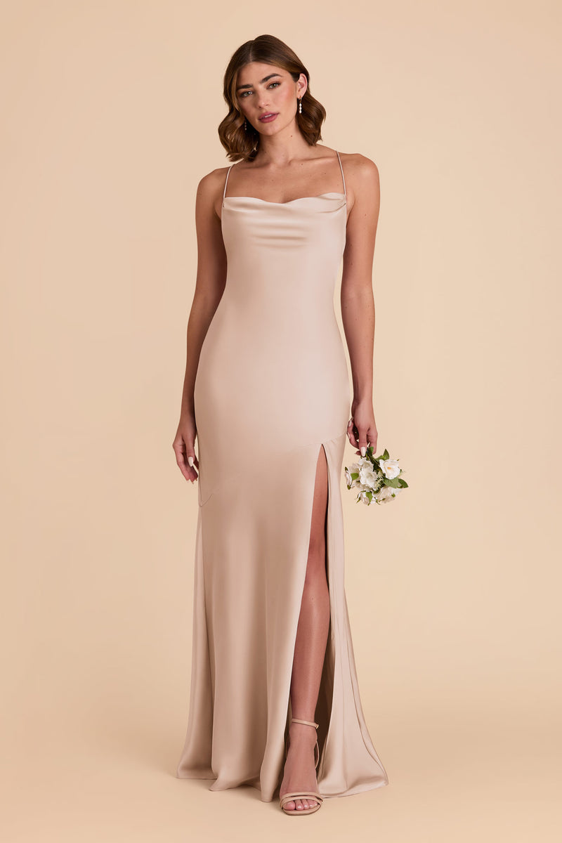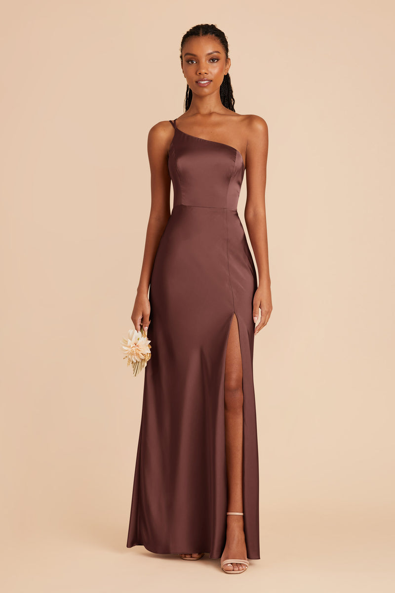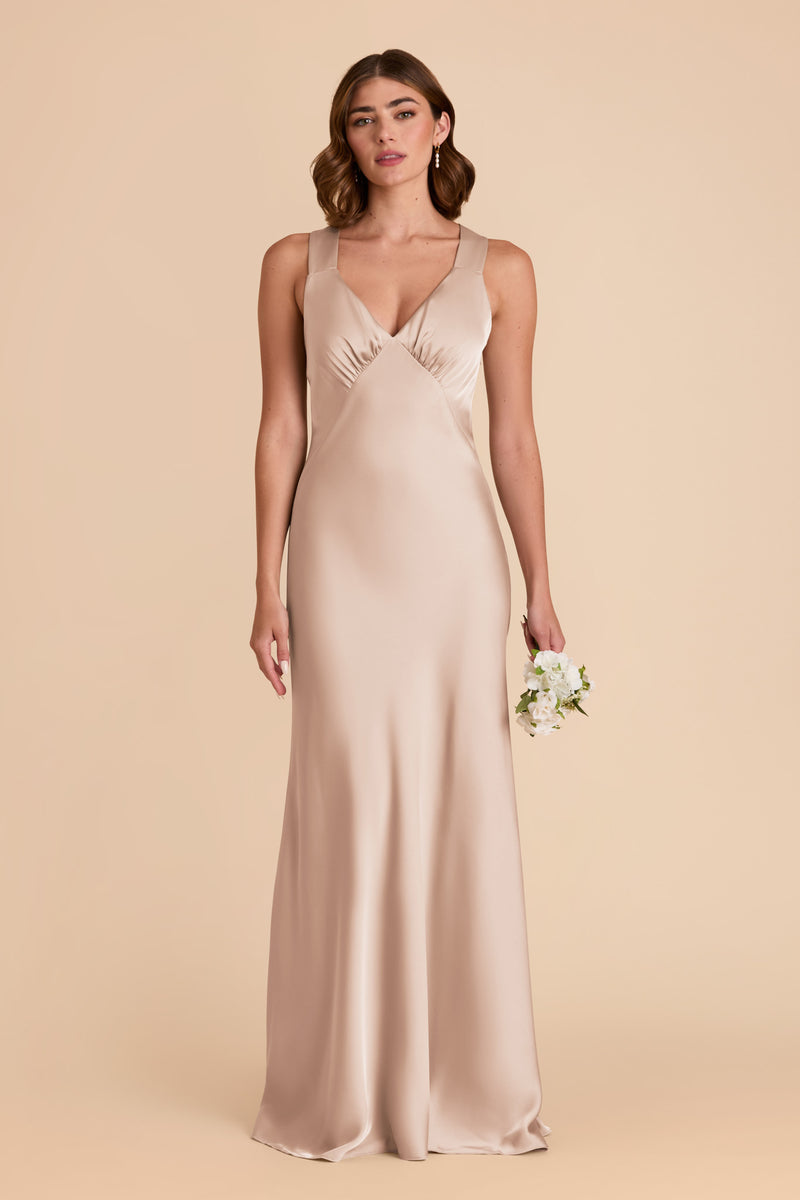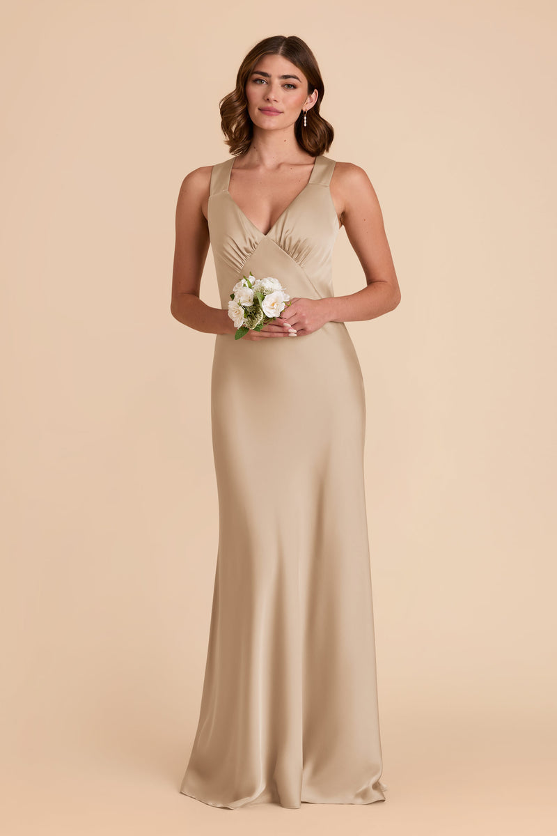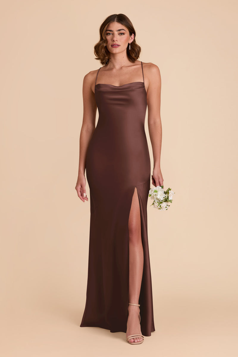 Stunning gowns in earthy shades take on a sophisticated look in satin.